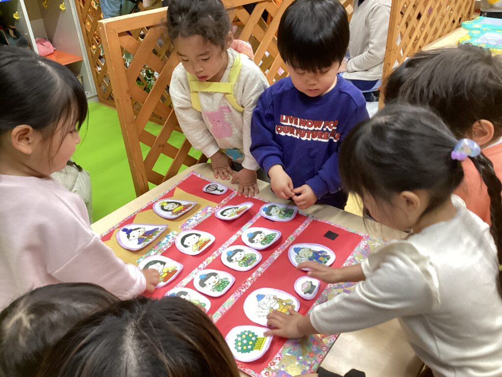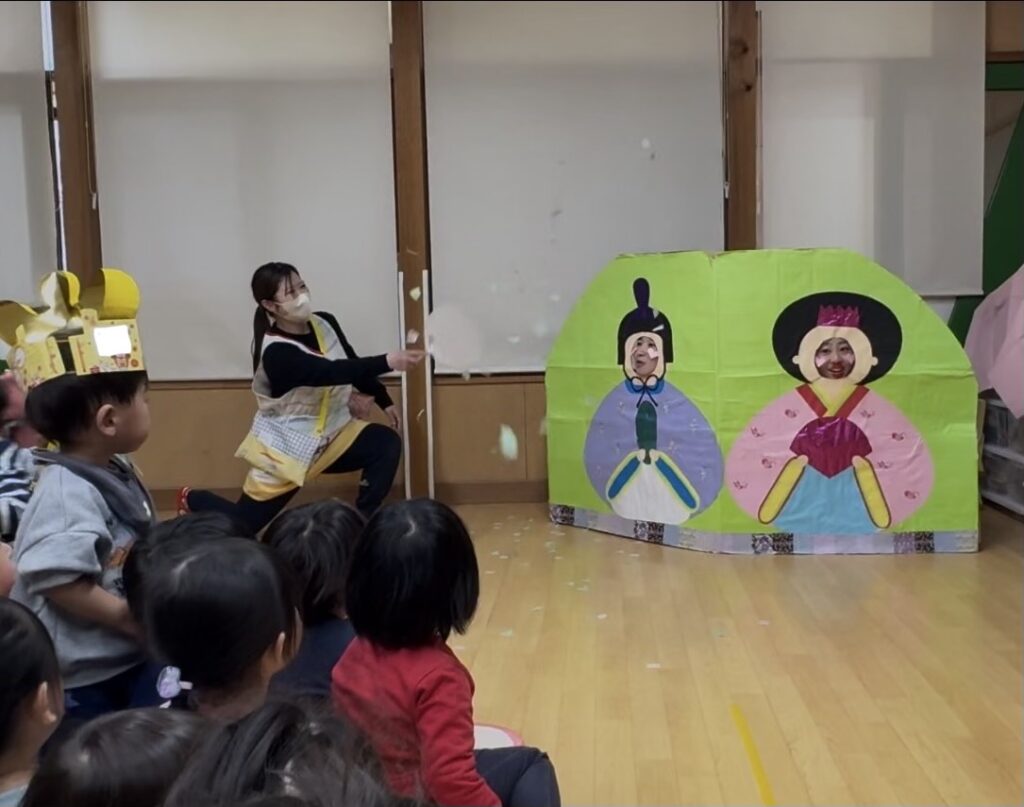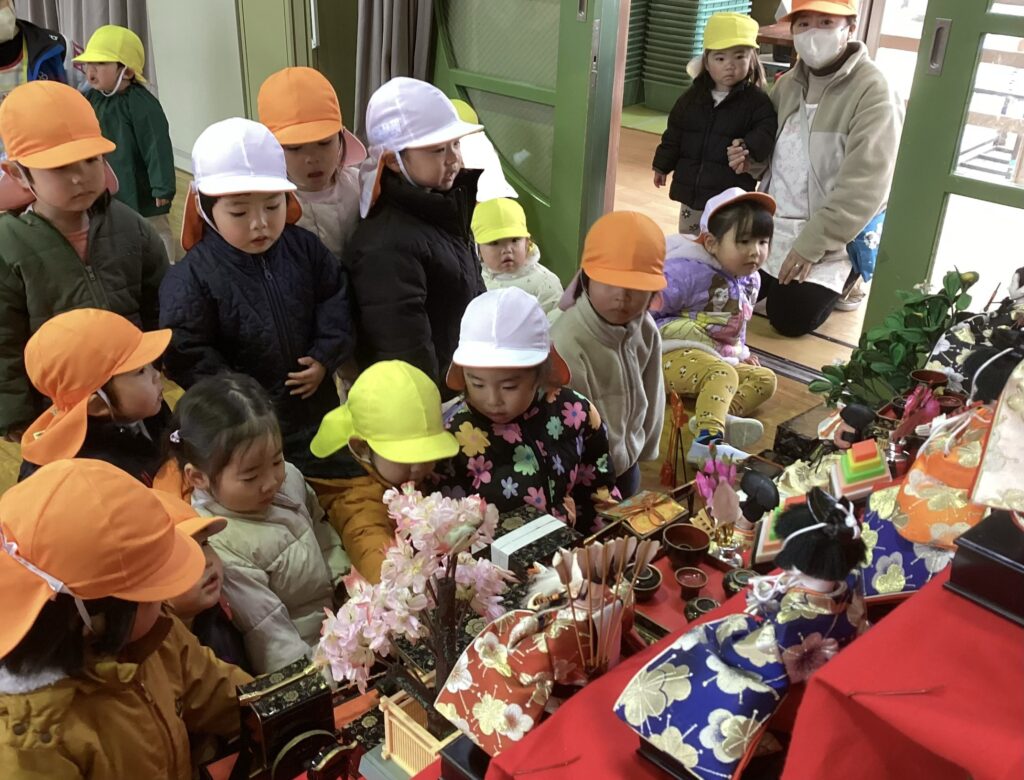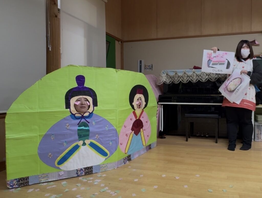 誕生会後はホールに飾ってあるひな人形を見に行ったり,歌に合わせてひな人形のパネルで遊んだりしました。
